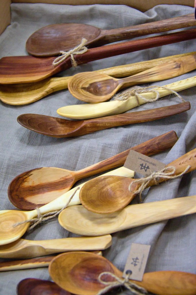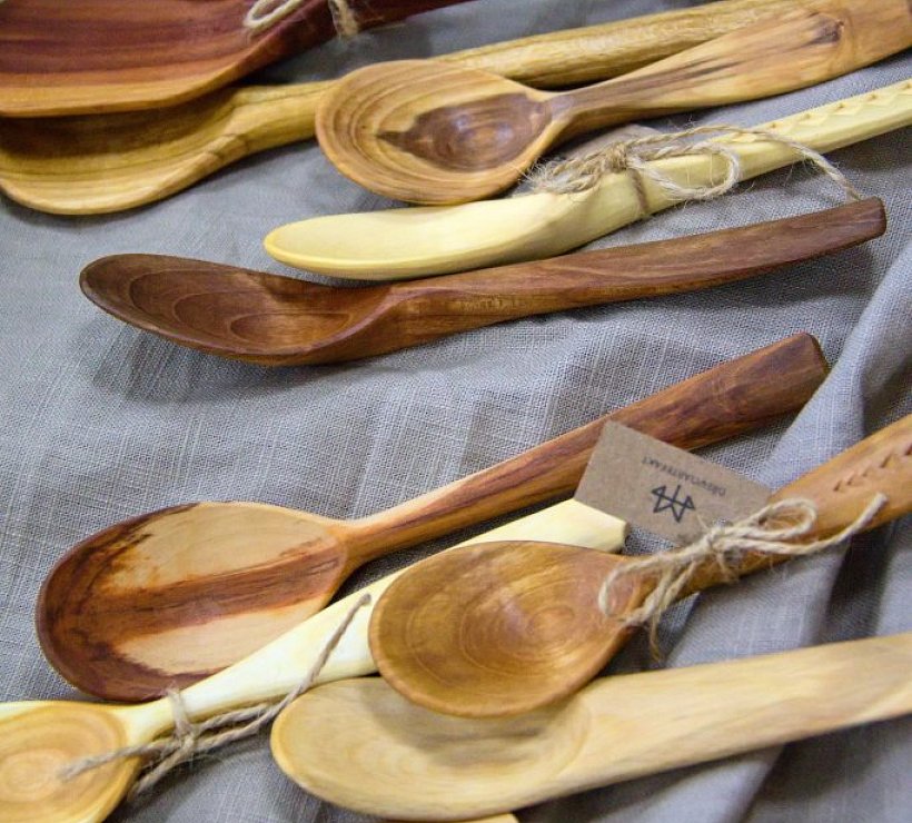 Funkční a jednoduché předměty pro dům a kuchyni – lžíce, vařečky, misky a další „artefakty“ ze dřeva.