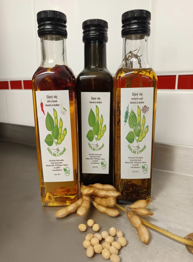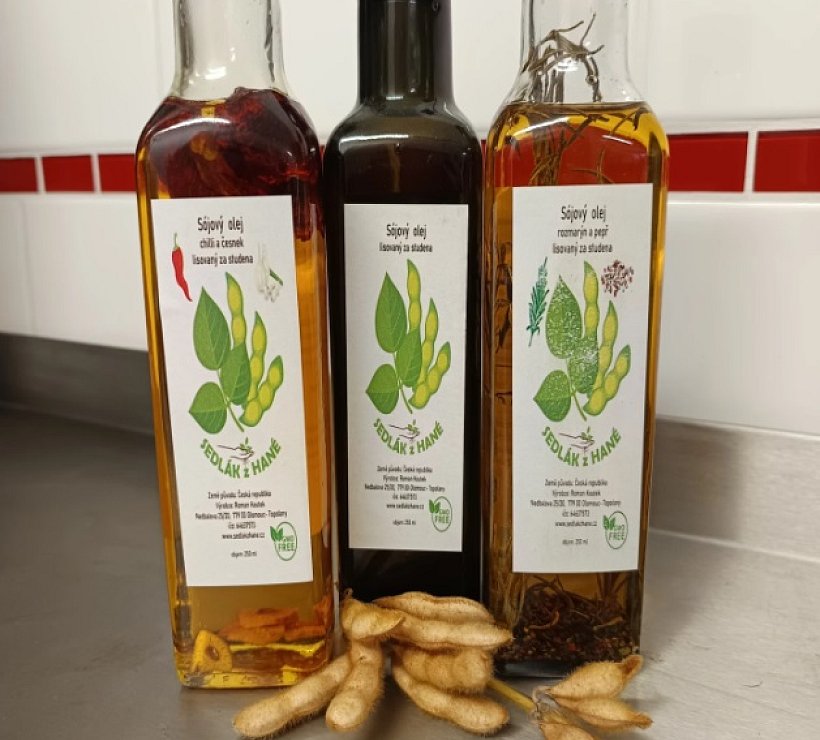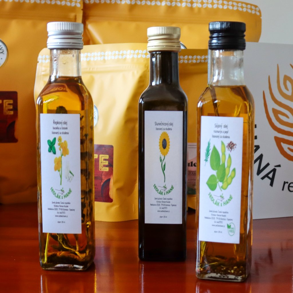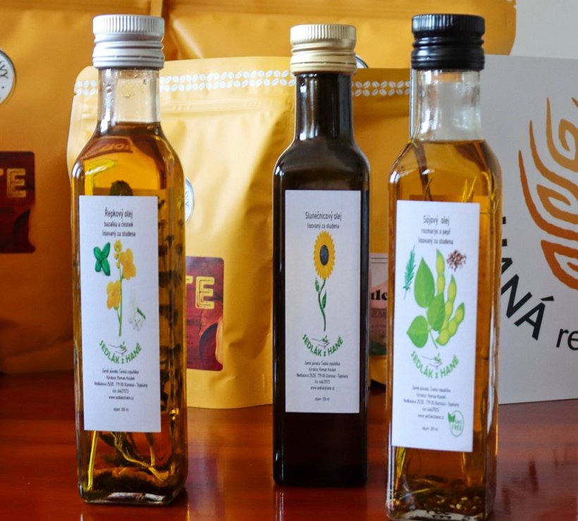 Oleje buď čisté, nebo ochucené vyrábí v olomoucké částí Topolany Roman Koutek – sedlák z Hané.
