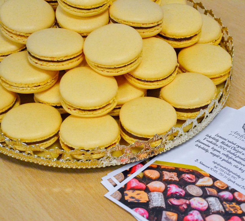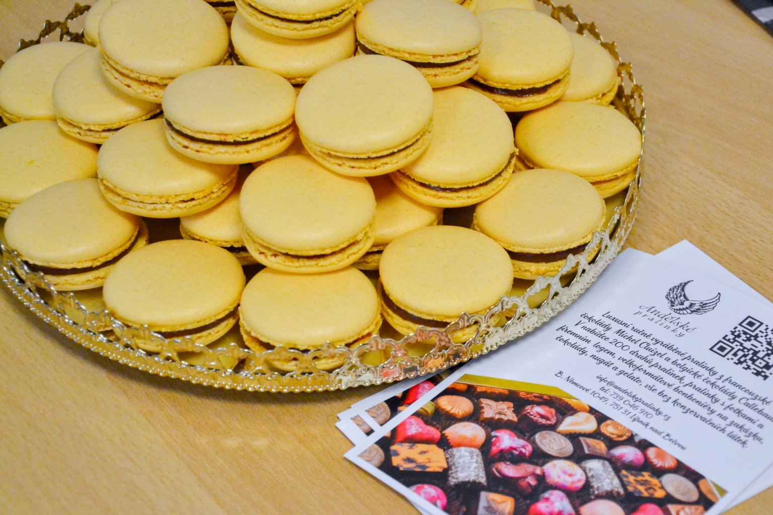 Makronky, z dílny Andělské pralinky, jsou vyrobeny podle tradiční receptury z mandlové mouky, cukru, bílků a barviva. Na náplň používaji máslový krém se smetanou. Na makronky lze na povrch dolepit fotku nebo logo na čokoládové destičce.