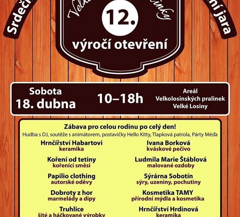 V SOBOTU 18.4. SLAVÍ VELKOLOSINSKÉ PRALINKY 12. NAROZENINY