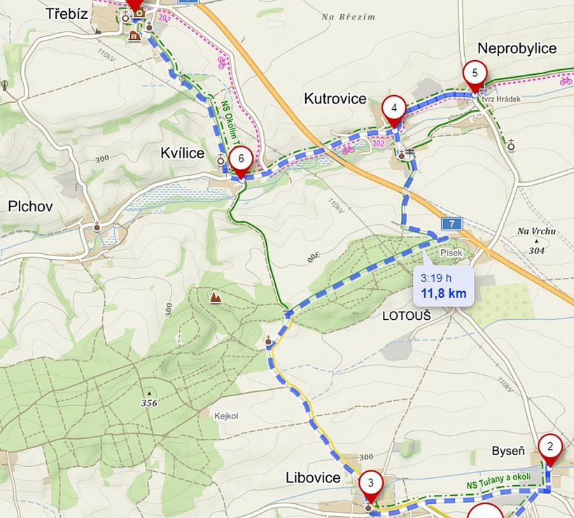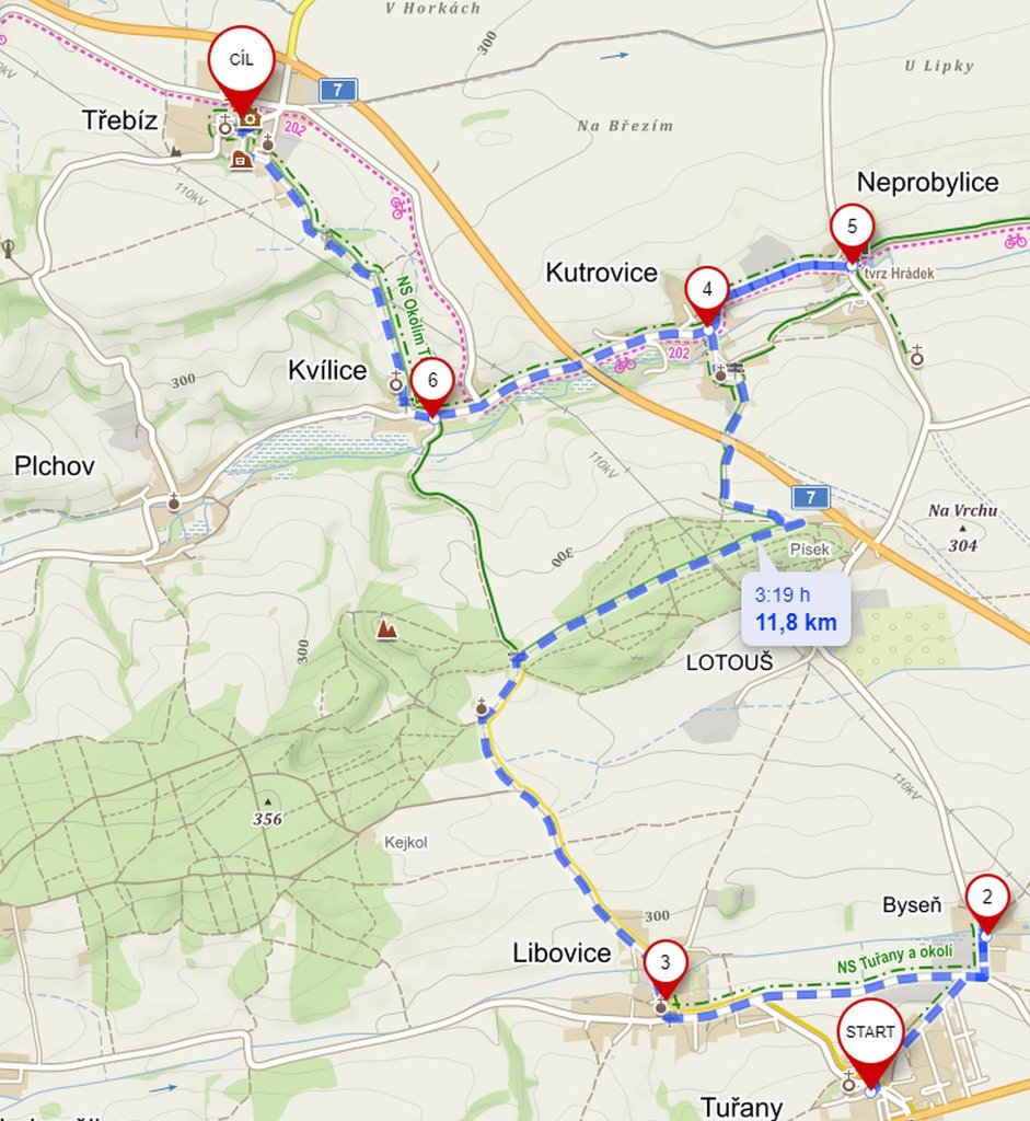 Trasa Tuřany – Byseň – Libovice – U Jána – Neprobylice – Kutrovice – Kvílice – Třebíz je dlouhá něco přes 11 kilometrů, ale pokud budete vyrážet ze Slaného, počítejte ještě s 5 kilometry navíc. Do Tuřan se ze slánského vlakového nádraží dostanete po žluté turistické značce. Trasu zvládnete pěšky, s terénním kočárkem nebo třeba na kole. Převýšení je v tomto kraji zanedbatelné 141m↑ a 157m↓.