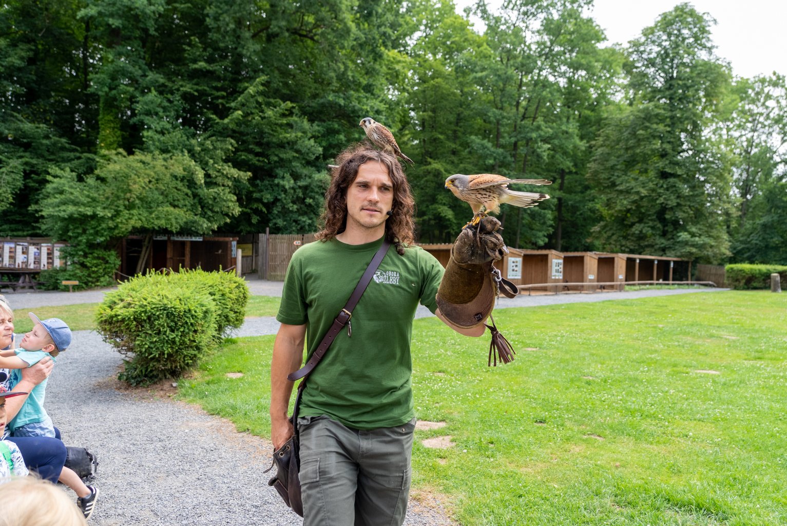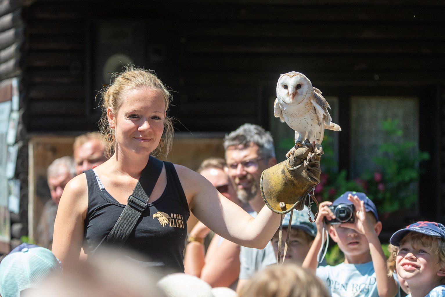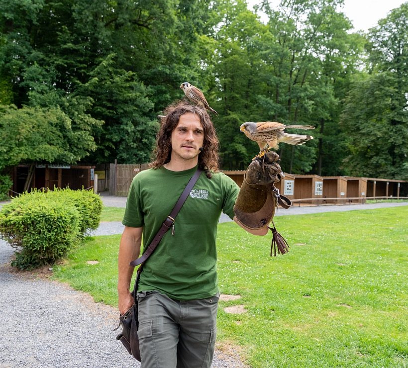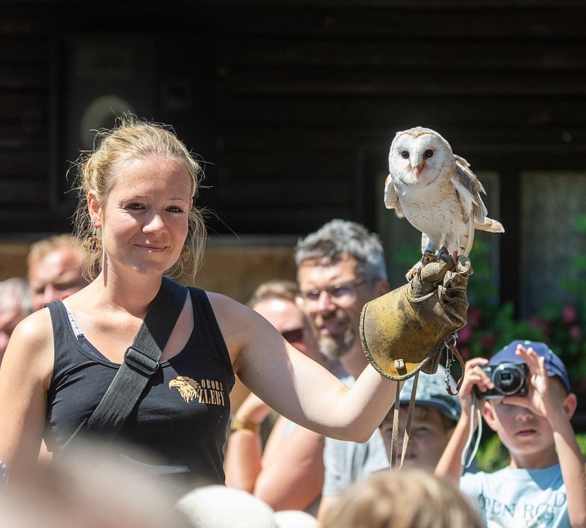 V oboře můžete shlédnout také jedinečnou ukázku dravců a sov. Naše ukázky se od ostatních liší v tom, že vypouštíme několik dravců a sov naráz a ti se pak pohybují ve vhodném prostředí lesní obory a jsou tu doslova jako doma. Dravci jsou na sebe zvyklí a tak se míjejí v těsné blízkosti navzájem i těsně nad hlavami návštěvníků. Je tu možné v jednom okamžiku v letu vidět raroha, káně, luňáka, několik orlů, supa a krkavce. Při ukázce pak dále uvidíte sovy naší přírody od sýčka po výra, poštolky a další.