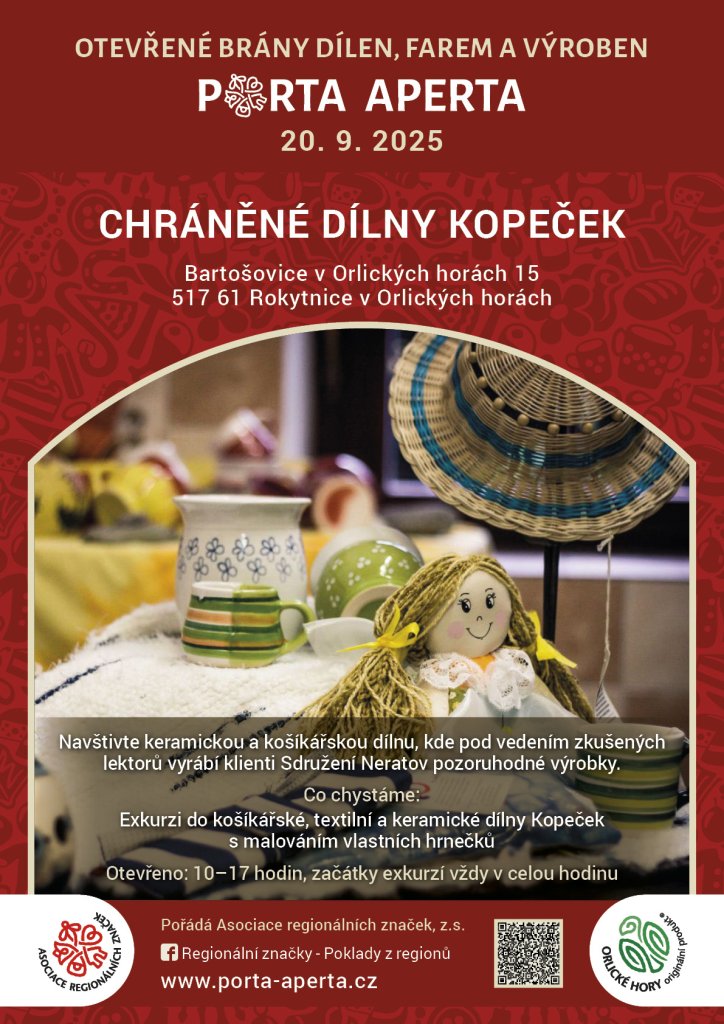 Zveme vás na exkurzi s výkladem do keramické a košíkářské dílny. Exkurze začínají v každou celou hodinu a trvají přibližně 20 minut. Cena je 60 Kč/os.