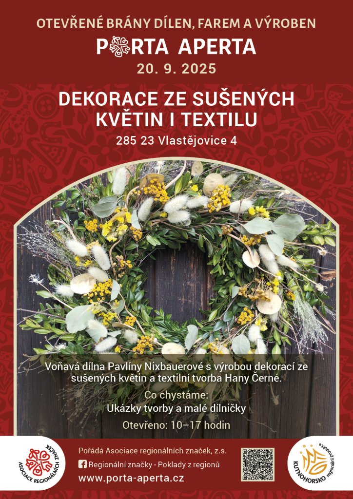 Přijďte se nabít energií do voňavé dílny Pavlíny Nixbauerové, v níž vážeme věnce a další dekorace ze sušených květin, které krásně doplní textil Hany Černé.