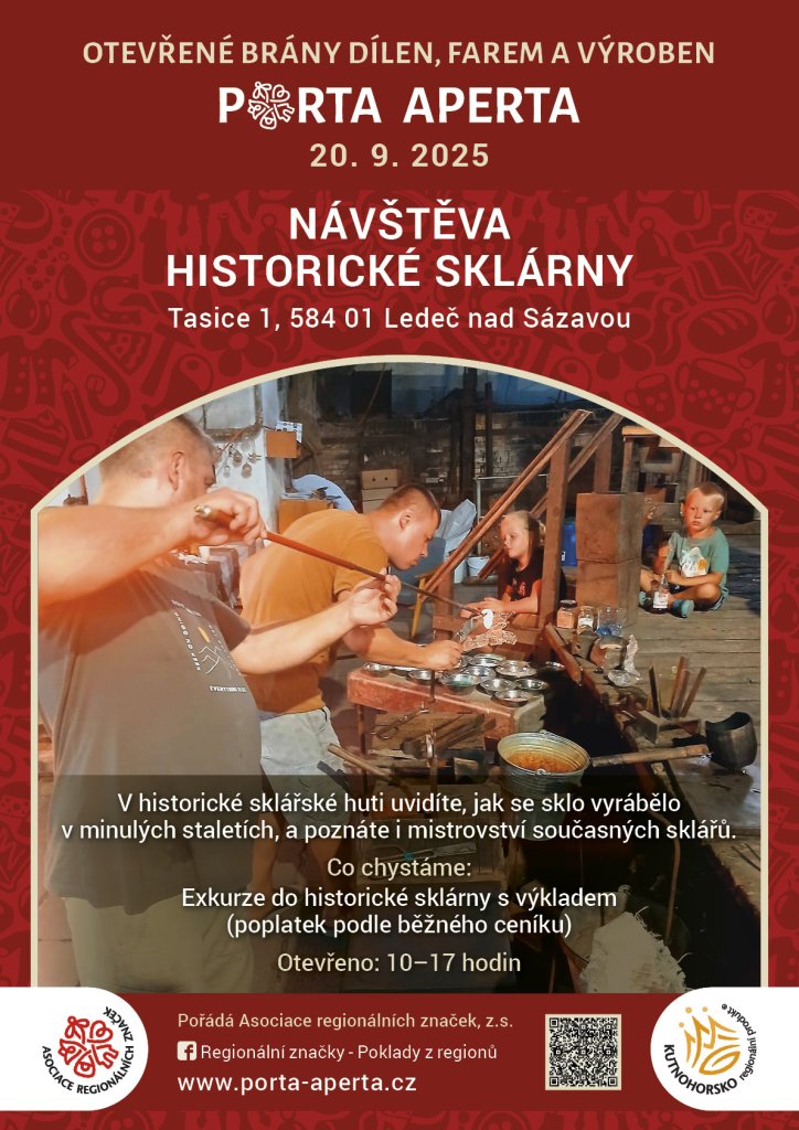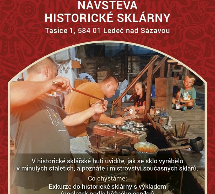Zveme vás do histrické sklárny v Tasicích. Byla založena již v roce 1796. Jedná se o jedinečný soubor historických budov přístupný jako výjimečně zachovalý sklářský skanzen.
