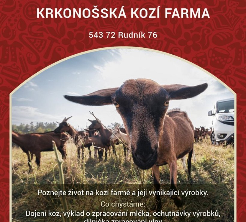 Uvidíte stádo 40 koz, vyzkoušíte si jejich dojení, dozvíte se vše o zpracování mléka a ochutnáte naše výrobky, které si budete moci přímo na místě i zakoupit.