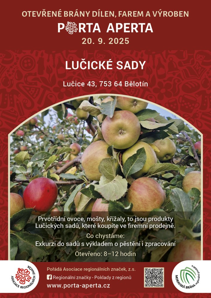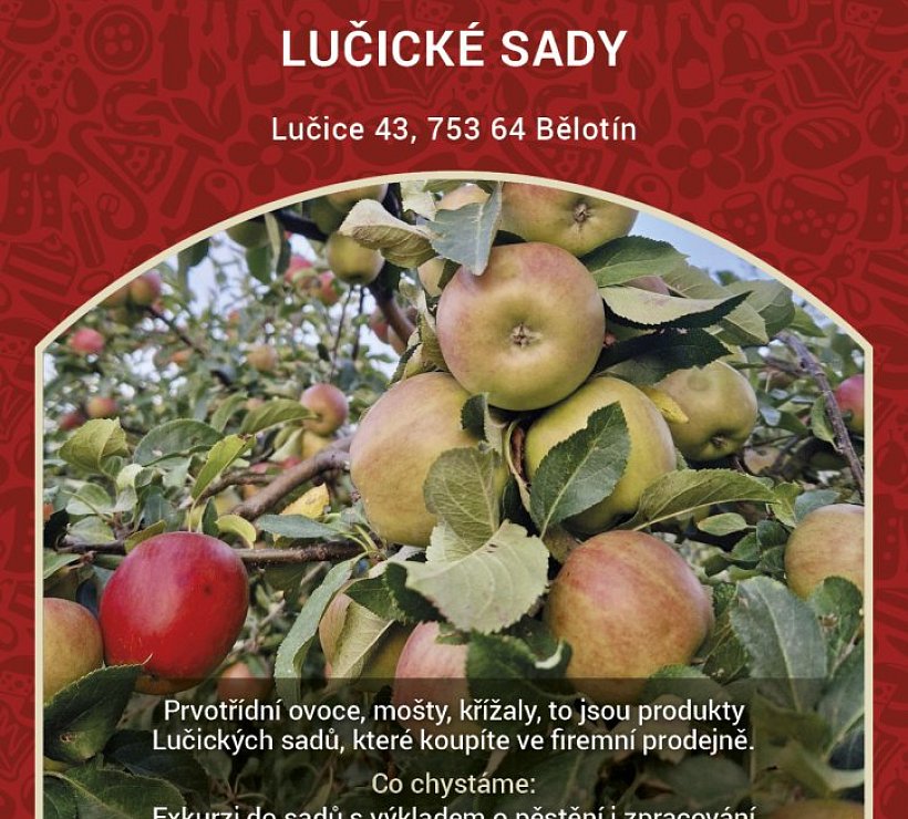 Prvotřídní ovoce, mošty, křížaly, to jsou produkty Lučických sadů, které koupíte ve firemní prodejně. Výjimečně se ale můžete podívat přímo do sadu a dozvědět se, co všechno předchází sklizni a zpracování ovoce.