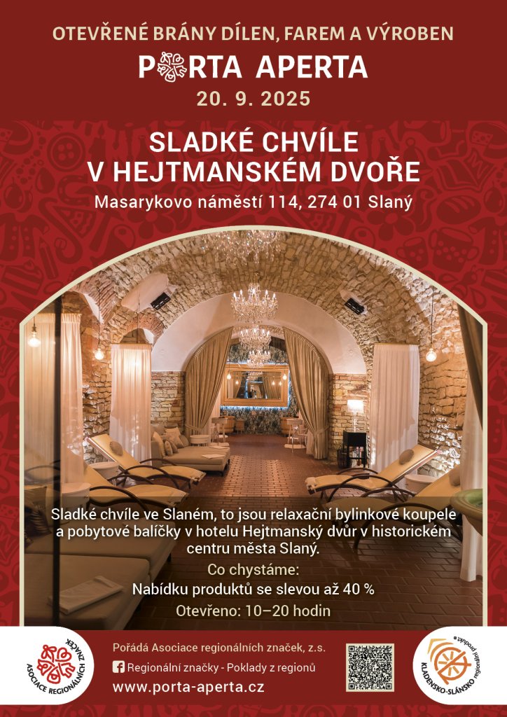 - Bylinková koupel se solí - wellness pro 2os. na 1,5 hod (koupel se solí, solný peeling, odpočinková zóna s bio saunou a zážitkovými sprchami - cena po slevě 40% 690 Kč. Hejtmanská sůl ze Slaného - certifikovaný regionální produkt jako dárek na cestu domů.