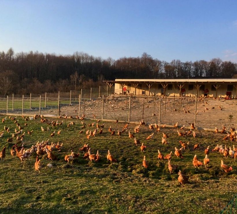 Chováme 450 nosnic po třech hejnech, která průběžně obměňujeme. Mladé nosnice si vychováváme sami od jednodenních kuřátek. Slepice se nacházejí v prostoru 2000 m2 s venkovním výběhem po celý rok a mají tak dostatek prostoru k pohybu a přístup k čerstvému vzduchu. Krmíme převážně pšenicí.