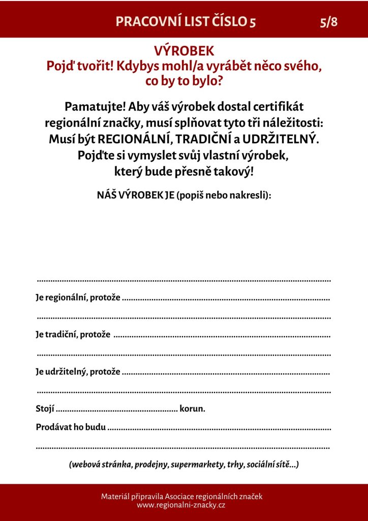 Pracovní listy byly připraveny pro území regionálních značek na česko-polské hranici, kde budeme v průběhu jara vybírat školy a třídy, které se pošlou nejzajímavější výstupy. Později budou materiály k dispozici pro všechny regiony sdružené v Asociaci regionálních značek.